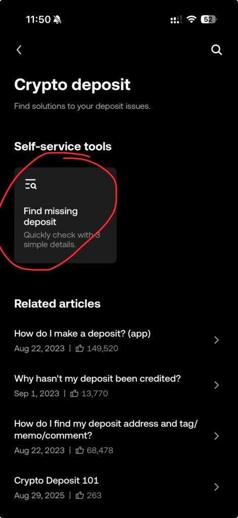1. Go to your exchange’s Help Center and search for “Deposit Not Arrived” or “Self-Service Recovery”.